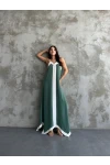 Elbisenin genelinde hakim olan zümrüt yeşili tonu, ön kısmında ve etek ucunda yer alan geniş beyaz blok detaylarıyla çarpıcı bir kontrast oluşturuyor.