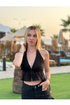Boyundan Bağlamalı Sırtı Açık Keten Bluz