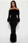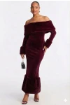 Kadife Kumaş Kürk Detaylı Maxi Elbise Bordo
