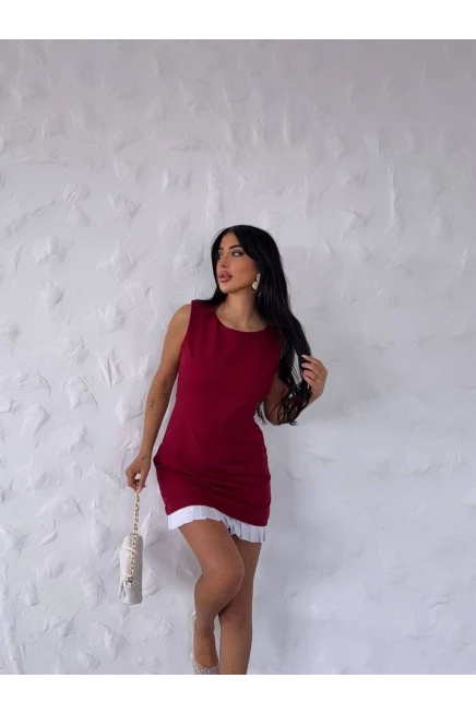 İthal Dabıl Kumaş Pileli Elbise Bordo