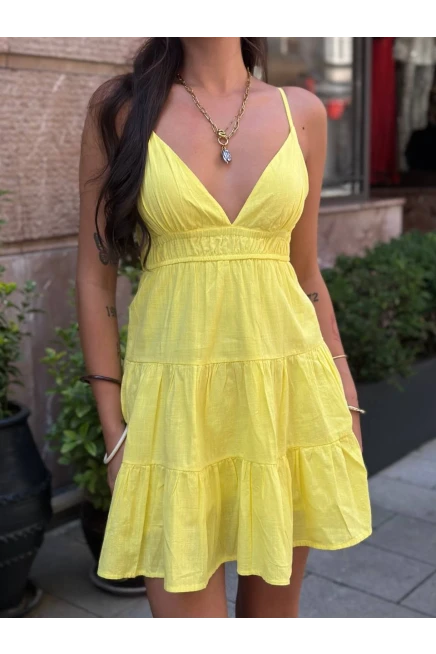 Arkası Bağlama Askılı Keten Elbise Sarı