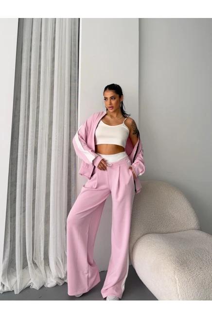 Oysh Kumaş Bel Lastikli Alt Üst Crop Üçlü Takım Pudra