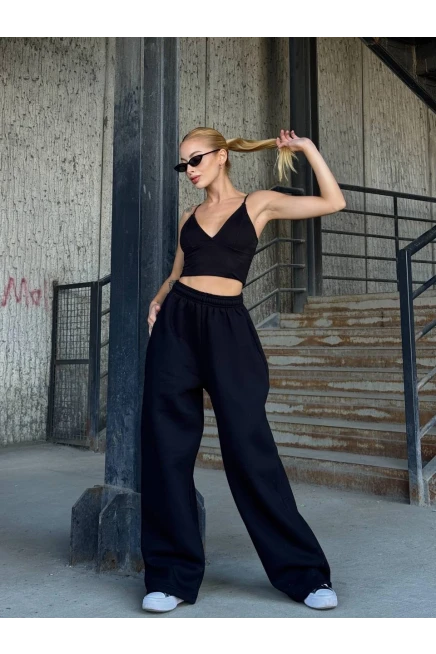 Yüsek Bel Cepli Paça Detay Siyah Eşofman Altı
