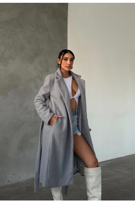 Buklet Kumaş Kuşaklı Mont Gri