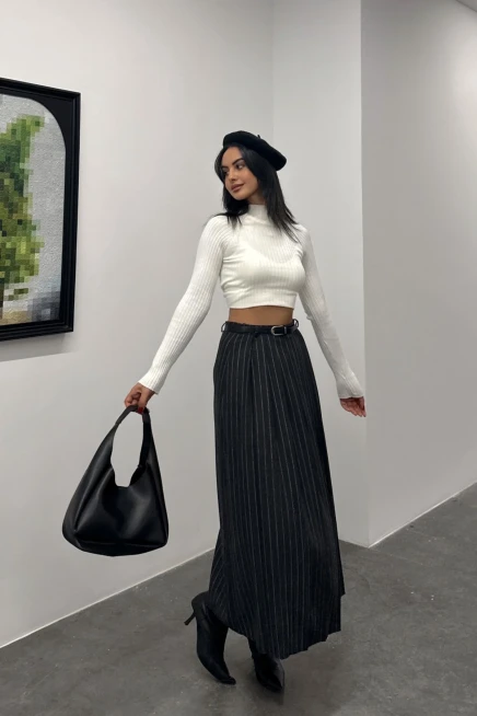 Çizgili Pileli Kemer Detaylı Etek