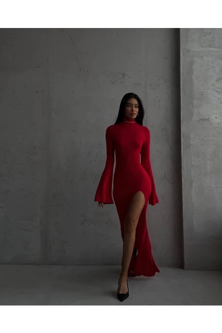 Sırt Dekolteli Kol Detaylı Yırtmaçlı Elbise