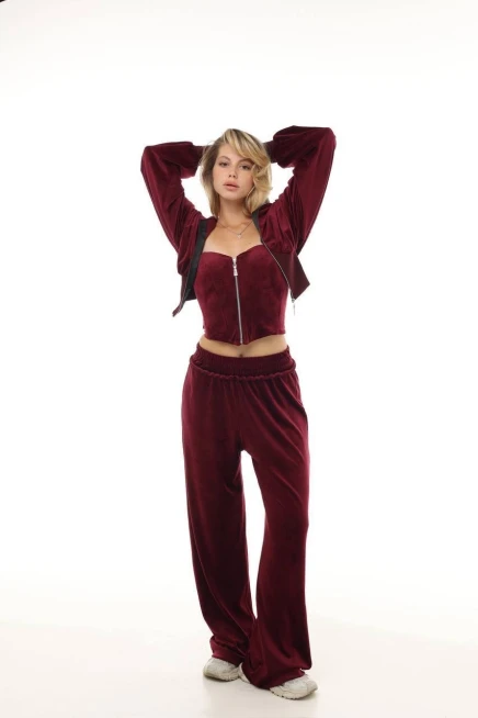 Kadife Kumaş 3'lü Eşofman Takımı Bordo