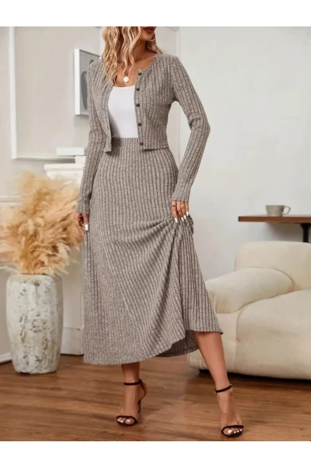 Uzun Kollu Düğmeli Bluz Uzun Etek Kaşkorse İkili Takım