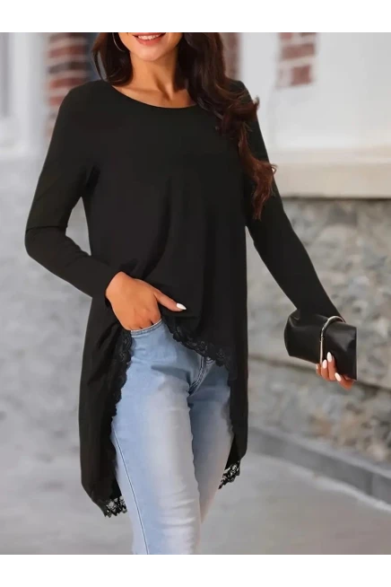 Uzun Kollu Bisiklet Yaka Asimetrik Kesim Detaylı Dantelli Viskon Bluz