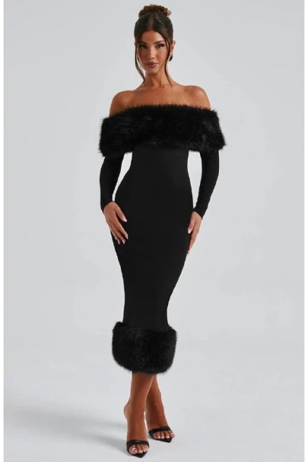Modal Kumaş Kürk Detaylı Maxi Elbise