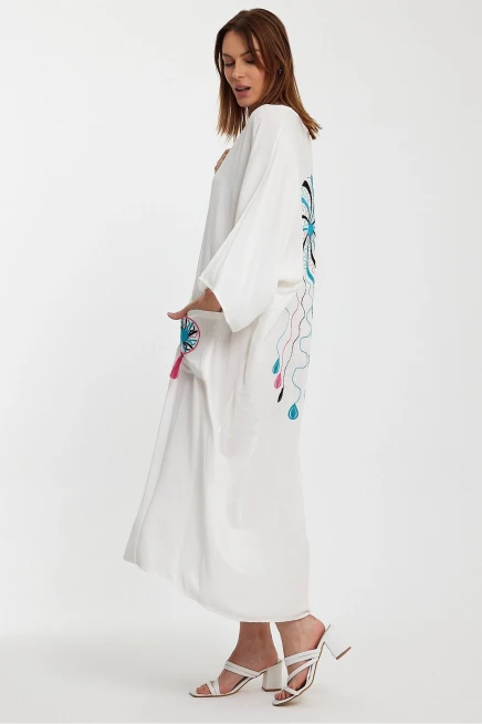 V Yaka Düğme Kapalı Nakışlı Büyük Beden Gömlek Elbise