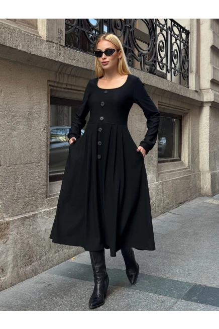 Ottoman Kumaş Düğme Detay Elbise Siyah