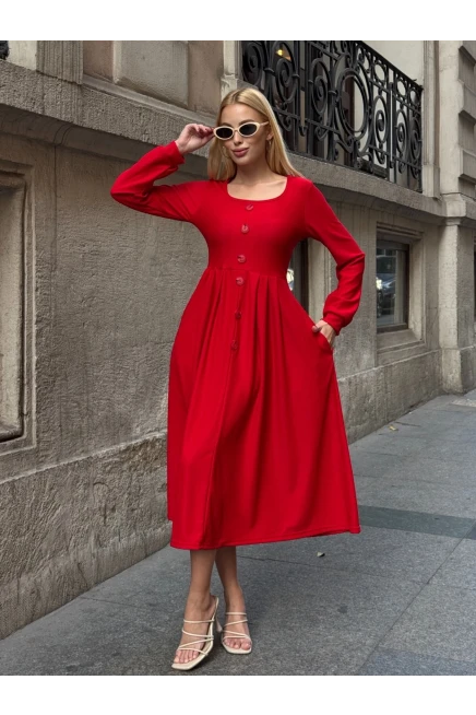 Ottoman Kumaş Düğme Detay Elbise Kırmızı