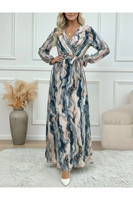 Kadın Uzun Kollu Kruvaze Yakalı Beli Kuşaklı Desenli Süprem Maxi Elbise
