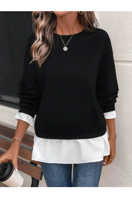 Kadın Uzun Kollu Bisiklet Yaka Viskon Iki Iplik Ve Etek Ucu Trikoton Bluz