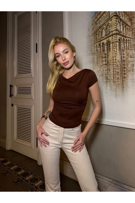 Yan Büzgülü İki Yönlü Giyilebilen Kısa Kollu Kahverengi Crop