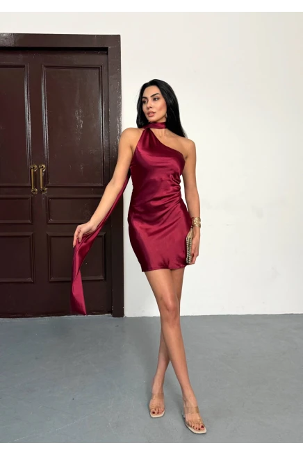Kadın Boyun Detay Saten Mini Elbise Kırmızı