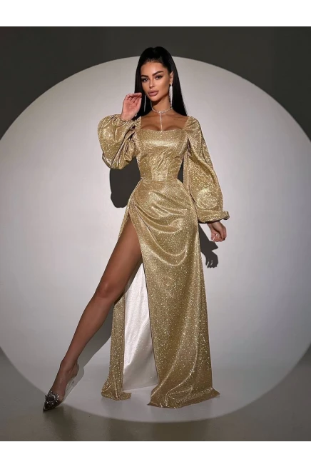 Simli Kumaş Sırt Detay Yırtmaçlı Maxi Boy Elbise