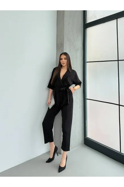 İthal Atlas Kumaş Kruvaze Yaka Tulum Siyah