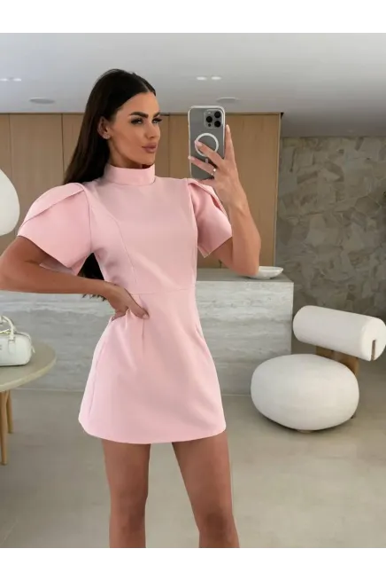 İthal Double Atlas Kumaş Fermuarlı Sırt Detay Mini Elbise Pudra
