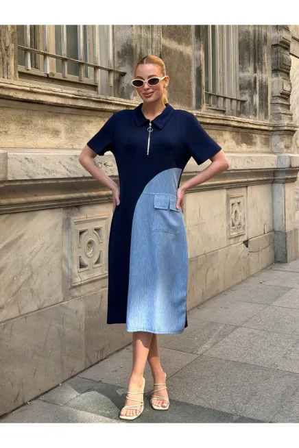 Lacivert Fermuar Detay Modal ve Tensel Kumaş Elbise