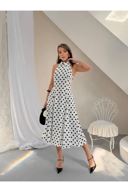 Puantiye Desen Sırt Detay Midi Boy Elbise Beyaz
