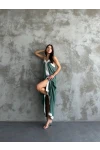Elbisenin genelinde hakim olan zümrüt yeşili tonu, ön kısmında ve etek ucunda yer alan geniş beyaz blok detaylarıyla çarpıcı bir kontrast oluşturuyor.
