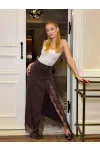 Kadın Sandy Kumaş Dantel Detaylı Yırtmaçlı Uzun Kahve Etek