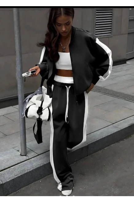 Oysh Kumaş Bel Lastikli Alt Üst Crop Üçlü Takım Siyah
