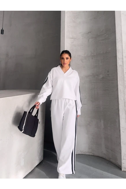 Üç İplik Şardonlu Yanları Şerit Takım Beyaz