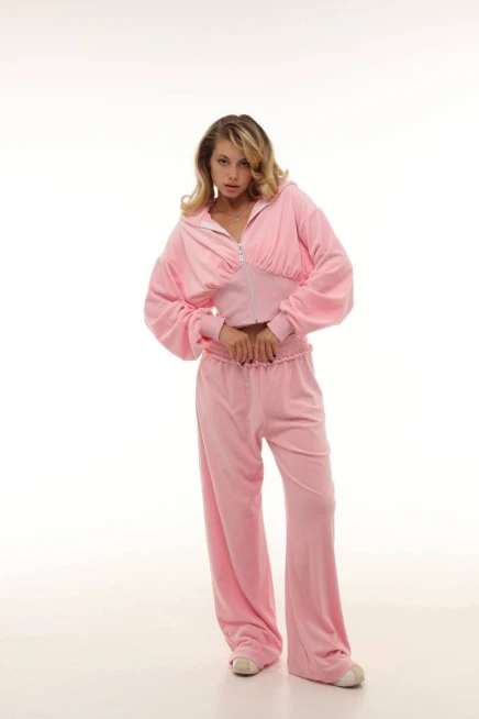 Kadife Kumaş 3'lü Eşofman Takımı Pembe