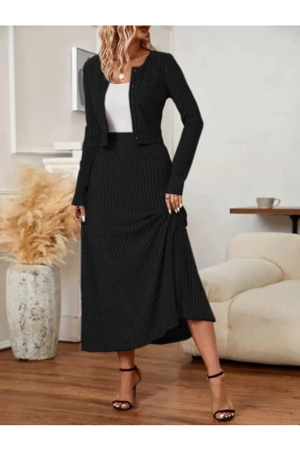 Uzun Kollu Düğmeli Bluz Uzun Etek Kaşkorse İkili Takım