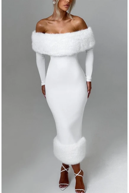 Modal Kumaş Kürk Detaylı Maxi Elbise Beyaz