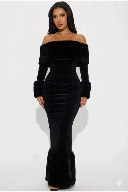 Kadife Kumaş Kürk Detaylı Maxi Elbise Siyah
