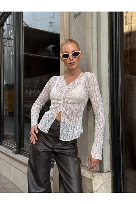 V Yaka Yırtmaç Detay Bürümcük Dantel Bluz Beyaz