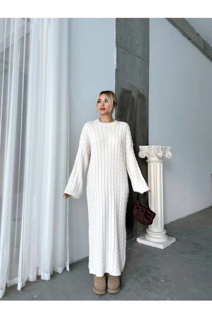 Kadın Ekru Bisiklet Yaka Saç Örgülü Kadın Triko Midi Elbise