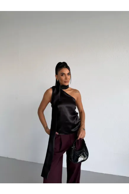 Yaka Detay Saten Bluz Siyah