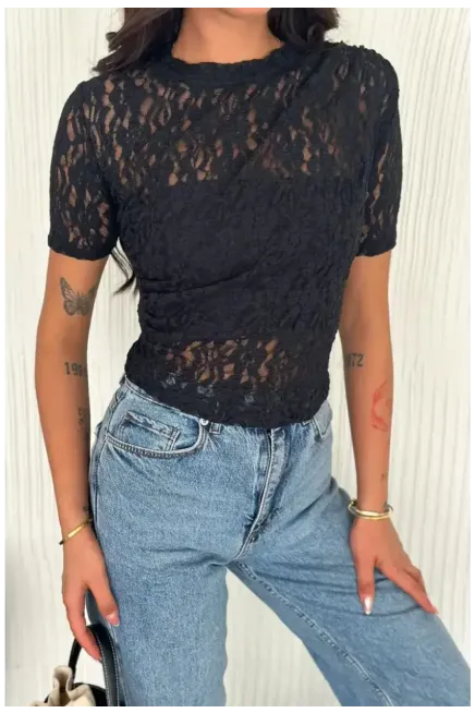 Kadın Siyah Dantel Kısa Kollu Bluz