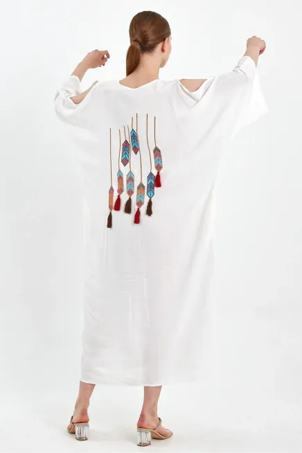 Beyaz Sırt Etnik Nakışlı Maxi Boy Gömlek Elbise