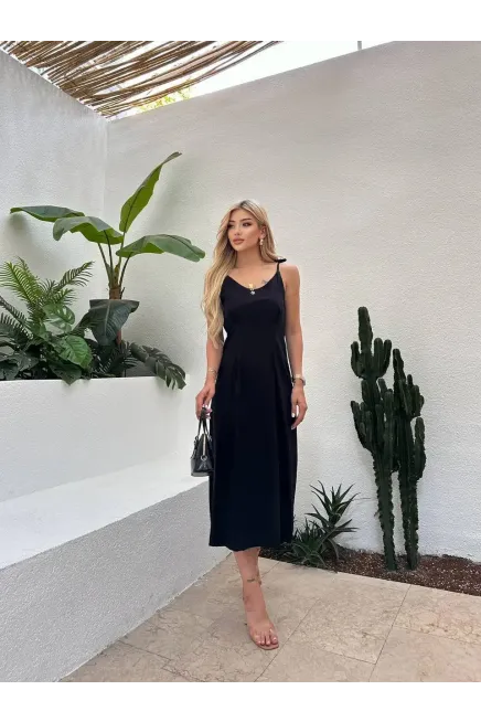 Drape Detay Omuz Bağlamalı Midiboy Keten Elbise Siyah