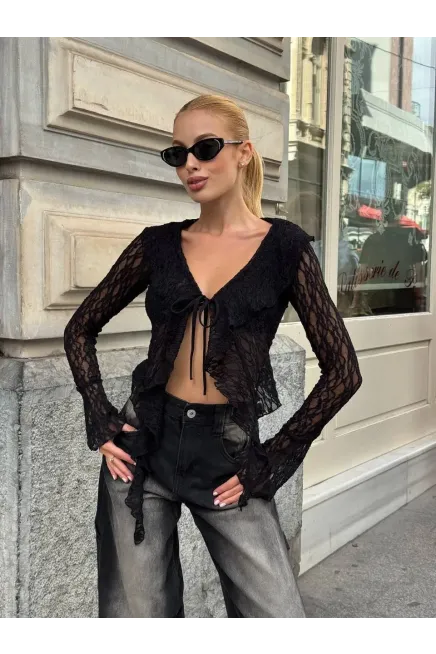Pervazlı Dantel Kumaş Siyah Bluz