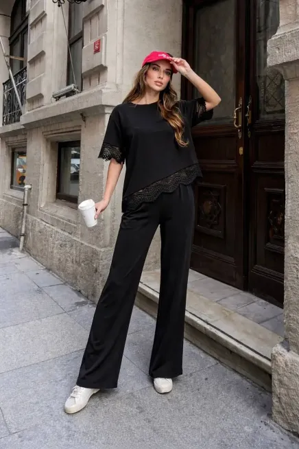 Dantel Detay Modal Kumaş Alt Üst Takım Siyah