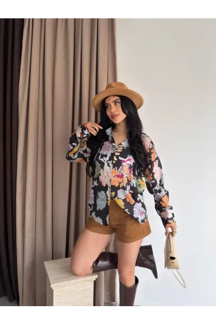 Kadın Renkli Çiçek Desenli Saten Gömlek